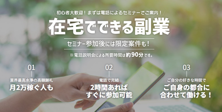 電話セミナーだけを受講し、案内された案件をいくつか申し込むだけでも数千円の報酬が発生します。複数案件をまとめて参加すればより高額報酬も狙えますが、報告や条件確認などの作業量も増えるため、無理のない範囲で挑戦しましょう。